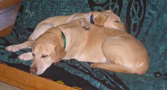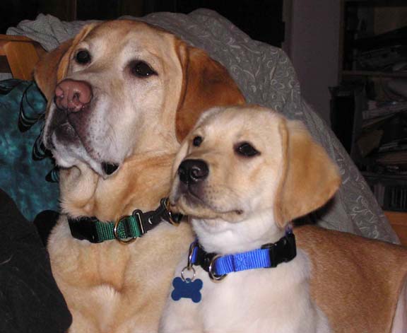 This is Sashisu's St. John's Water Dog; AKC SR13661704 - we call him St. John (Sin-jun.) He has a variety of other nicknames: Singe, as he is forever wagging his tail against the wood burning stove and singeing it. Small Dog, as he is the smaller of my 2 yellow labs. And Butthead, to name a few.