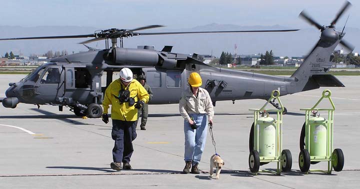 We have just started our training and it takes about 2 years to complete all the required skills sign-offs and certify. In addition to searching, SAR dogs must demonstrate: obedience, sociability with other dogs, sociability with people, swimming, transport (traveling with other dogs over a bumpy road in the back of a pick-up truck), helicopter hot loads, as well as a variety of trails in wilderness and urban environments. To the right is a picture of St. John (at 4 months) completing his first hot load in an Air National Guard Blackhawk. A hot load exercise consists of the team approaching the helicopter, getting in, strapping in both dog and handler, unstrapping, exiting and leaving the zone. This all must be done with dog and handler calm and under control while the helicopter rotors are in motion. It gets pretty loud and windy in the rotors wash. St. John was happy to get away from the big, loud, metal beast.